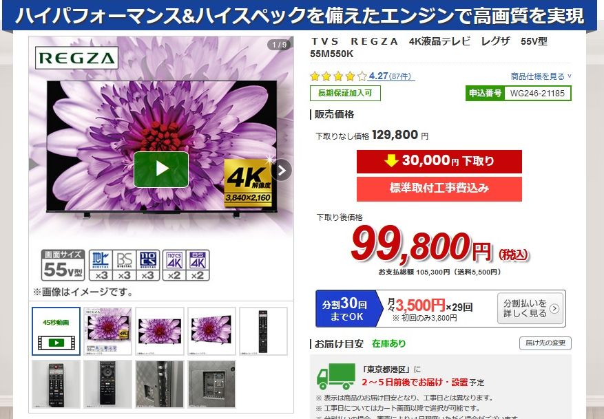 従い、婆さん曰くジャパネットだと下取り値引きな上に引き取ってくれるし多少高いが55インチの4Kテレビが10万円程で購入出来ると言います。色々調べると確かに現行品を引き取って設置まで行ってくれる仕組みを使う事にしました。