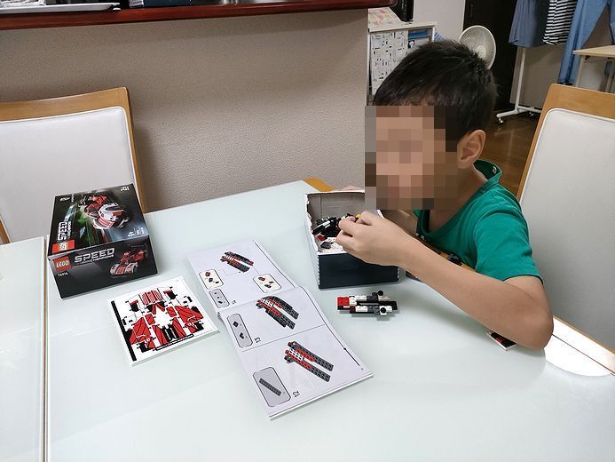 来る前に何かおもちゃをと思って、Legoブロックの車を買っておいたのですが、箱を空けるなり組立始めましたよ、この種Legoブロックは9歳以上と有りますが、6歳で説明書を見ながら出来るんですね~