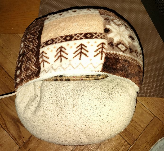 これは一昨年から利用しておりまして、夏場に洗濯して保管していました。婆さんに出して貰いましたよ~~足元にフットウオーマークッションに小さなアンカを入れて温めております。