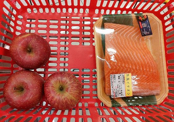 赤いカゴに、赤いリンゴとサーモン^^見ずらいですね~~100g当たり333円でして総重量460gありますね、爺の酒の肴として数回持ちますよ^^