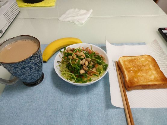 そうです、お椀にキャベツの千切り+人参の細切り+豆苗+茹で大豆+ツナ缶に、オリーブオイルと御酢に胡椒を掛けております。そして食パン1枚+バナナ1本ですね。これにコーヒーマグカップ1杯分です。食後にヨーグルトを小さめ1個ですね。