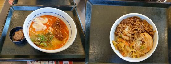 左側は爺の注文した「エビ味噌坦々うどん@690」です、右側は婆さんは塩分が一番少ない「牛すき丼@530」を注文した様子です。ま~自分に合ったものを選ぶのが一番良いですよね~~