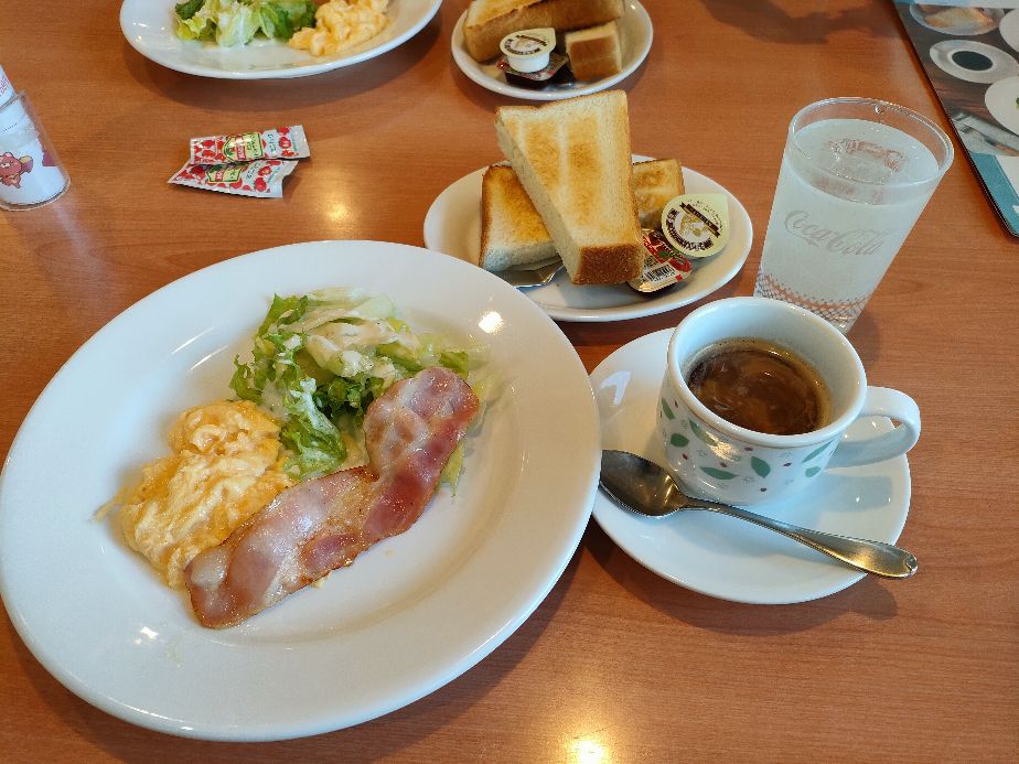 野菜+スクランブルエッグ+ベーコン+厚切りトースト1枚分+ドリングバーが付いて、@450円ですよ~~物価高の世の中で信じられないでしょう~~そこで夜のメニューも調査に来店しないと駄目だね~~と婆さんとの意見が一致しましたよ。
