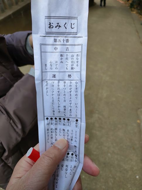爺は「中吉」を引き当てました。婆さんは「凶」やはりね~病に悩むここ数年ですから、当たっているのか?特に「病は医者に任せろ」とあります。そうそう、自分で判断せず医者に言う事を聞きなさいって事でしょう~~