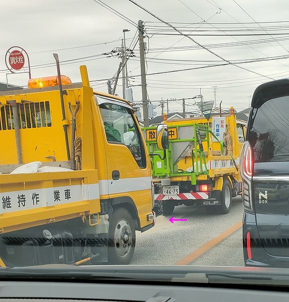 そうです、爺は小用で区役所へ向かった際に見つけた物とは、そうです「市道路作業車」が2台連なって走っている横を爺が信号で停まったのですが、先頭の車が道路に砂の様な物を落としています??