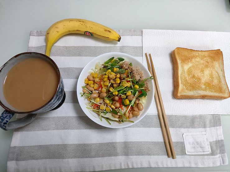 特に野菜サラダですが~千切りキャベツ+人参細切り+豆苗+コーン+茹で大豆+ツナ缶。ですよ~それに食パン1枚に蜂蜜を塗ってます。それにバナナが1本とマグカップにコーヒー+牛乳少々ですね~