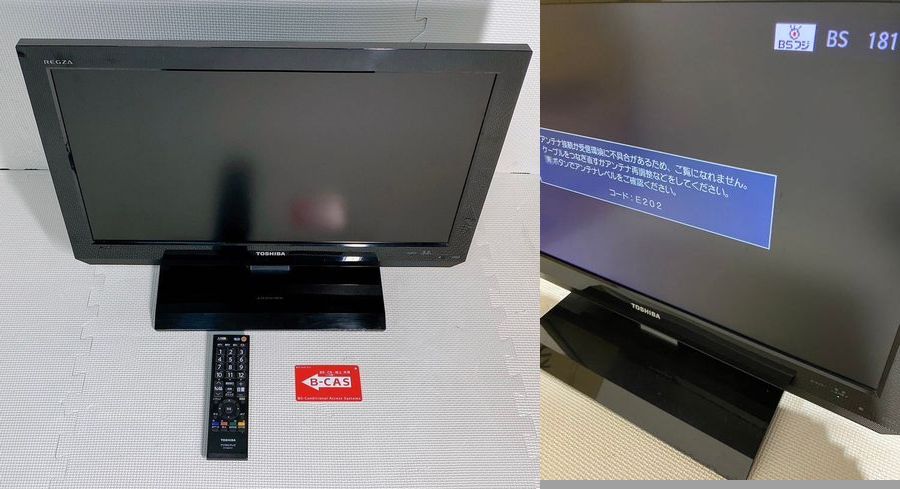 22インチ東芝のTV、リモコン及びB-CASカード付き、電源も入る状態ですよ。届いてみないと判りませんが~~爺は掘り出し物だと期待しております。