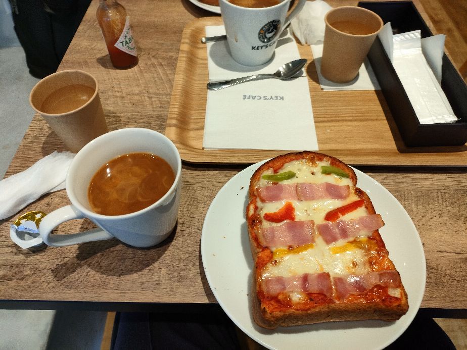 婆さんから、**日は眼科だよ~と言われて、気づく程(爺は認知症?^^まさか)時折カレンダーに書き込みする度に意識は有るんだよな~~ただ眼科へ行くにはバス一本では行けず、先ずはバスで東急の駅迄行きそこから1駅乗って行きます。歩いても行くるが婆さんは歩くの厳しく、雨も降っていたものでモーニングは駅北側の「キーコーヒー」にてピザトーストセット600円