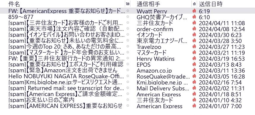 爺のメールにも毎日のように届きます(笑うに笑えない)そこで迷惑メールのフォルダを見ると、以下の通りですよ。