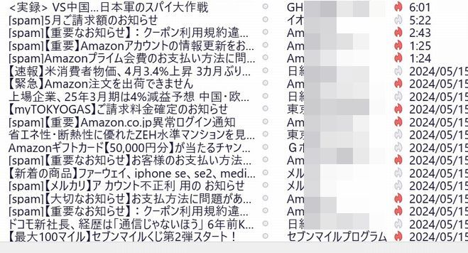 ま~多くはAmazonが多いかな~~色んな詐欺師がこぞって送るのでしょうね~無駄な事でしょうけどね~~そして爺のメーラーでは「spam」表示が頭に付いて、同時に日付の頭に赤い印が入ってくれて解り易いです。