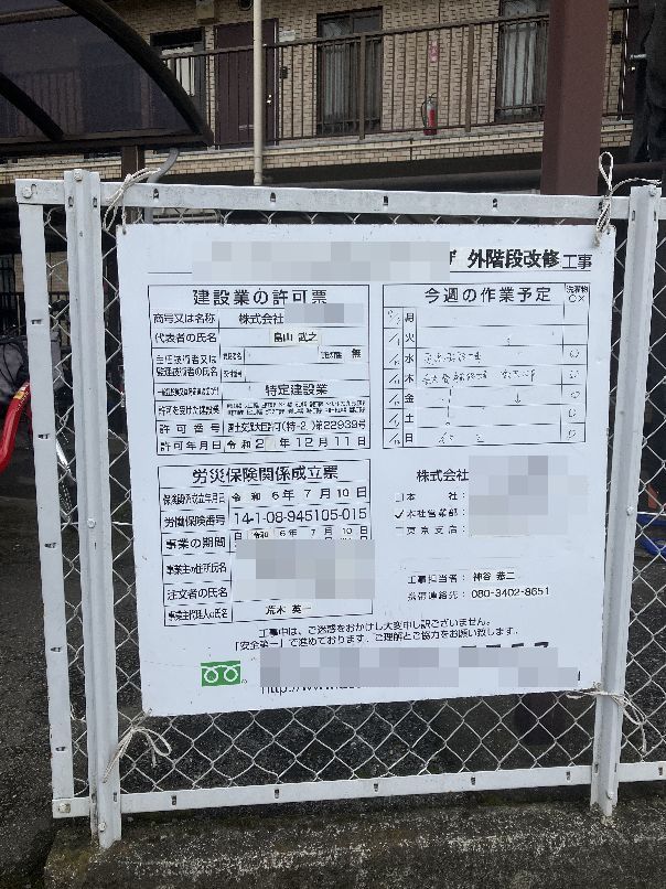 工事期間は約20日間、短い間ですが居住者全員に案内文書を配布と同時に掲示板にも解り易く表示され、同時に現場にも上記の様に掲示板を設けて頂いております。