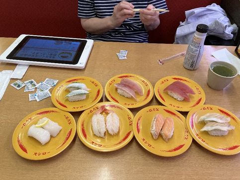 先日のランチ久々にスシローへそうです、婆さんが自宅では食欲出ないから「スシロー」へ行きたいと言います。爺としては断る理由なし。早速好みの醤油(浜すしにて購入)を持参して向かいました。 店は平日だしガラガラ、しかし子供の煩い声が轟くのが気になるな~~程度。 婆さん任せで適当に注文して貰い、2貫セットをジジババ1個ずつをシェアして頂きます。 回転すしは安価で美味しいですよね~~結果 結果11皿でした、金額は1360円だったかな??1人700円以下ですから安上がりですよ。 やはり好みの醤油持参だと味も違って美味しいですね。でも婆さんが一言、美味しさは「浜すし」かな~~と!!