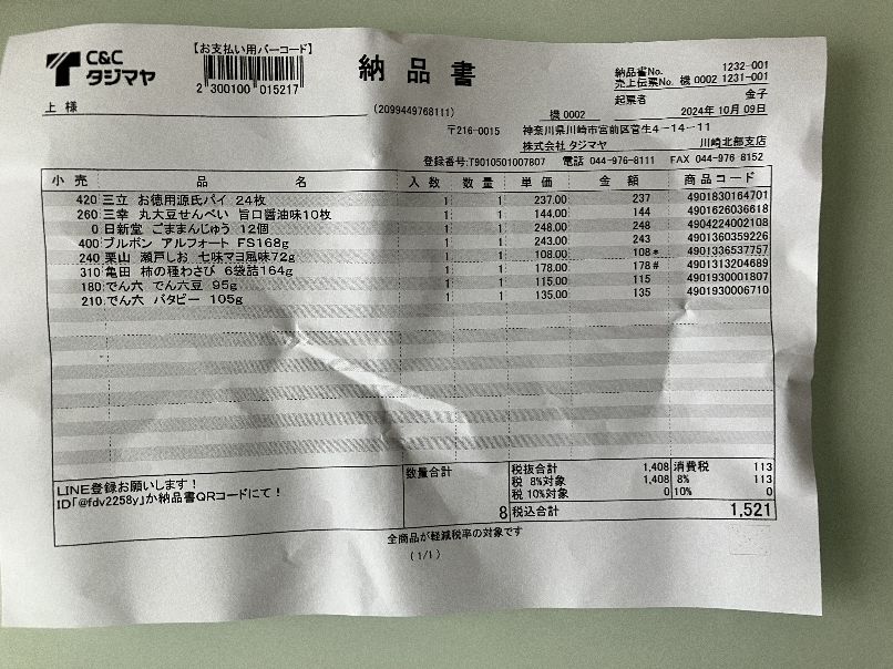 購入品8点です。婆さん好みも分をチャンと買っていますよ。結果費用は1500円強でした。