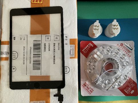 左側の商品は、ipadmini1/2用のデジタイザーガラス。右上はサークライン接続用プラグ、右下は20WLEDランプです。この品の裏側には磁石が3個付いていてサークラインの内部に貼りつく仕組みです。従い、サークラインを取り外し当該の品にプラグを付けて利用します。