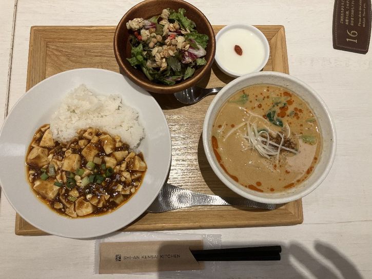 爺は、席に着いた時、隣の席で爺さん2人が食事されていて、サンプルメニューで見た「麻婆丼+担々麺のセット」量的に少なめですね。