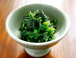 ◎青菜のナムル食欲をそそるごま油とにんにくの風味。ナムルの味付けはいろいろなお野菜に合います。何種類かのナムルとたまご、コチュジャンでビピンパにもなりますよ!ぜひ覚えて欲しい味。