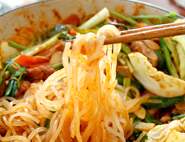◎タッカルビタッは鶏肉という意味で、鶏肉の炒め焼きのことです。たっぷりの野菜と一緒にコチュジャンの甘辛いたれで炒めます。テーブルの上で火にかけ、アツアツをみんなで!しめは、冷麺でどうぞ。