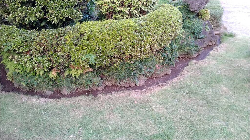 芝生の縁を、小さな釜で根切りをして、溝に入り込んだ芝の根を