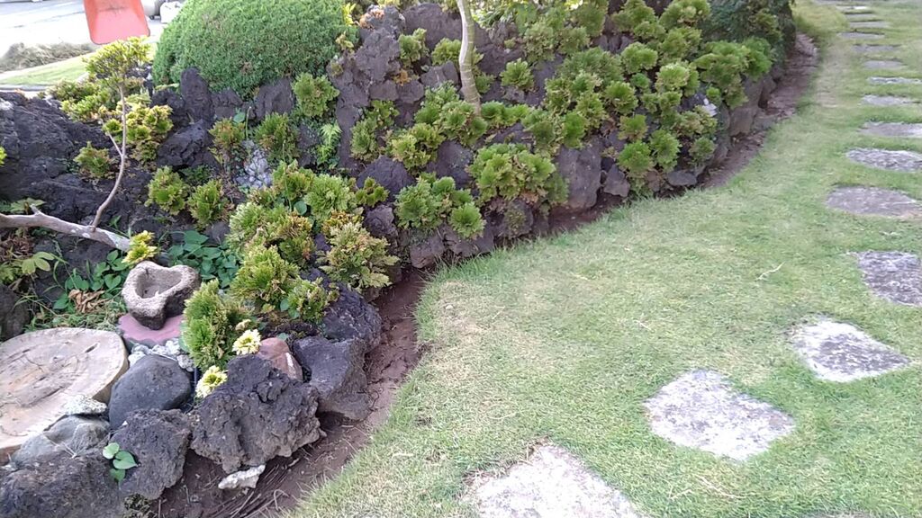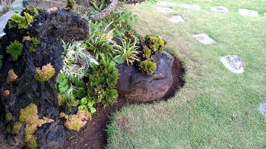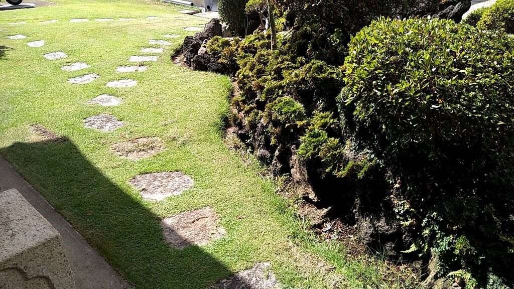 ブク石と芝生の間だ!