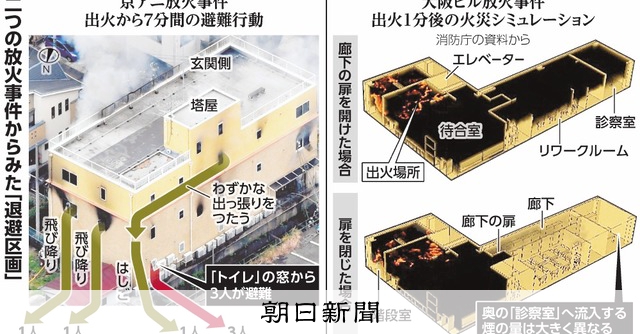 36人が死亡した京都アニメーションの放火殺人事件発生から18日で3年。昨年12月には大阪市北区の雑居ビルでも放火事件が起き、26人が犠牲になった。共に出入り口付近への放火とされ、出入り口からの避難は困難を極めた。総務省消防庁が検証する中、炎や煙から逃れ、脱出や救助にかかる時間を確保するための「退避区画」の重要性が指摘されている。(7月16日朝日新聞デジタルから一部引用)