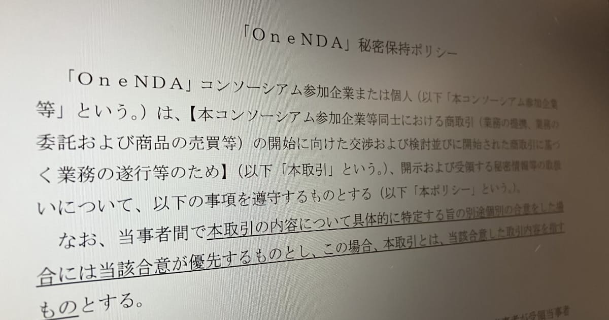 企業間で取引を始める際に取り交わされる秘密保持契約書を統一するプロジェクト「OneNDA(ワンエヌディーエー)」が、個人で仕事を請け負うフリーランスにも対象を広げる。現在は約200社が参加しており、参加者同士は新たに秘密保持契約を結ぶことなくすぐ商談に入れる利点がある。不利な契約を押しつけられがちなフリーランスの保護を進める期待も見込まれる。