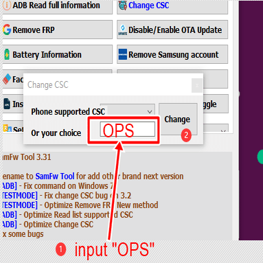 4)「SamFw Tool」を立ち上げ、「ADB」→「Change CSC」を選択