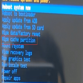 ④データ削除が終わったら、自動的にリカバリモード画面に戻る。音量ボタンでリストから「Wipe cache partiton」を選択し、次の画面で「Yes」を選択して、キャッシュを削除する。