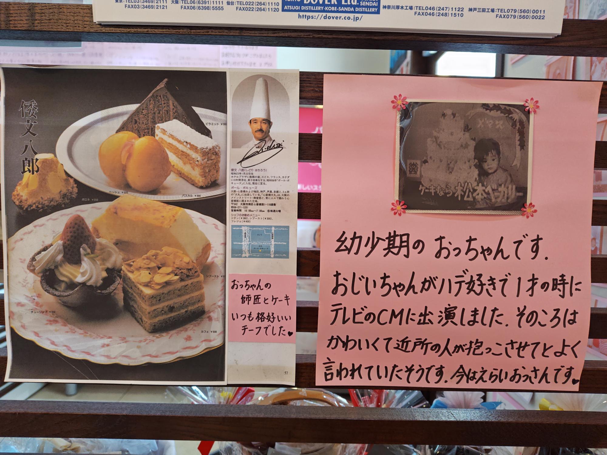 写真はおっちゃんの幼少時のもので、左側のコック帽を被った男性は倭文八郎(しどり はちろう)さんで、おっちゃんの師匠だそうです。この方、洋菓子業界では、専門学校の講師を務めるなど、倭文八郎さんに師事したパティシエさんがたくさんおられるという凄い方です。おっちゃんは倭文さんをずっと尊敬しておられて、こうして美味しいケーキが脈々と受け継がれていくのですね。それにしてもおっちゃんは1才でテレビCMに出演していたのですね。めちゃくちゃ可愛いです。