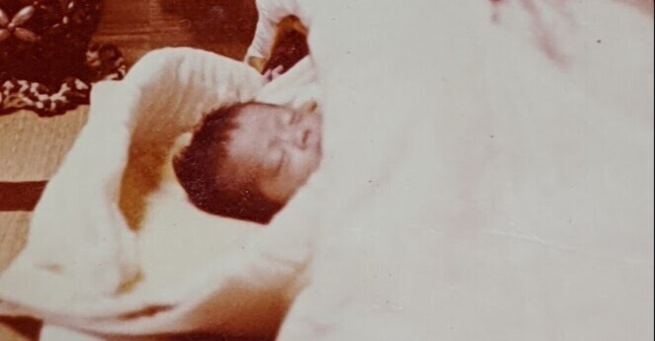 大きすぎるおくるみに、毛布と一緒に、ぐるぐる巻きに包まれている写真を見て、以前は