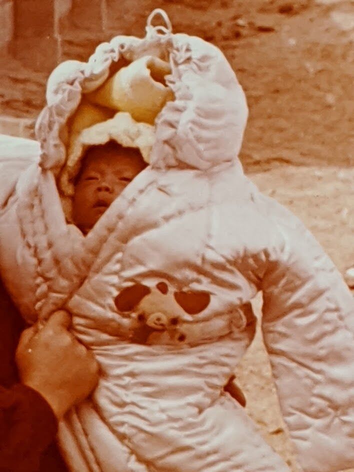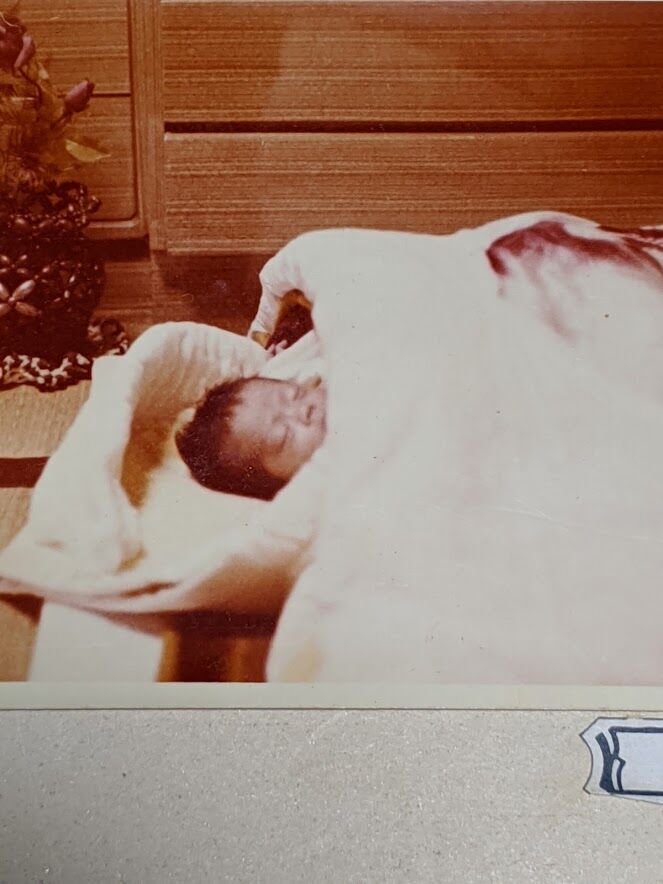 生まれた次の日に、産婦人科が火事になり、煙にまきこまれて、チアノーゼ状態になり、母はショックで母乳が出なくなり、私はミルクを全く飲まなくて、どんどん体重が減ってしまい、一ヶ月たって、やっと、出生時の体重に戻って退院できたと聞いているので、退院直後なのかもしれない。
