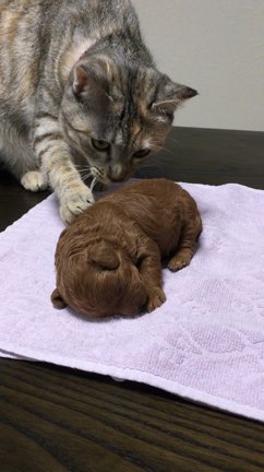 生後1週間のトイプーの赤ちゃんと猫のわさび(*^^*)