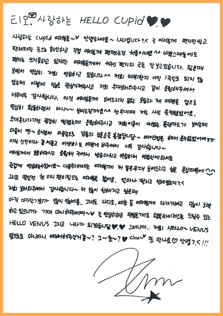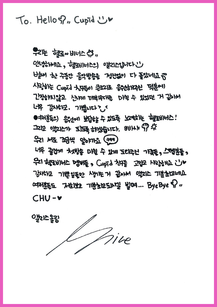 Hello Venusについての勉強をもっともっとしなくてば…先日の直筆メッセージ。とりあえず、どれを誰が書いたかは3人は判明。これはアラちゃん。これはライム。これはユンジョ。 今、足の靭帯痛めてるコね。残ってるのは、、、、てことは……。おそらくこれがアリス。これがナラ。そんでこれがユヨン。じゃないのか…と。。。