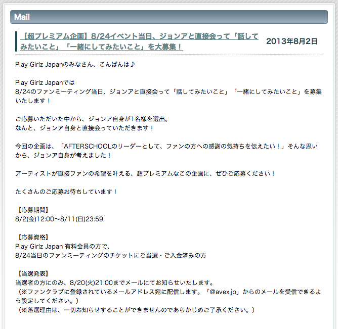 誰がジョンアお母さんと!誕生日は過ぎましたが、ラストスパート イヨンちゃんバースデー企画 参加者募集中! ※参加表明&詳細はT茶さんのブログにて TwitterでもOK♪ こちらもお願いします! カウン バースデー企画 参加者募集中! ※参加表明&詳細はえだまめさんのTwitterにて! ナナさんのセンイル企画もまだまだ参加者募集中! ※参加表明&詳細はrikapuさんのブログにてそういえば、これの結果発表は昨日でしたよね?ちなみに私にはメール届いてませんよ…( ̄д ̄「当たった!」ってツイートで出まわってるんじゃないかと思いましたが…。目にしてないなぁ…。エイベから箝口令が敷かれているんでしょうね。いったいどんなことをするんだろう???みなさん、応募しましたか?
