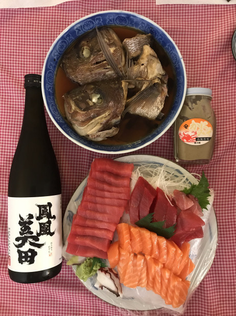 刺身と鯛のアラはタケズ魚屋で調達。特にここのマグロは絶品です。鳳凰美田が第2弾日本からのお土産です。