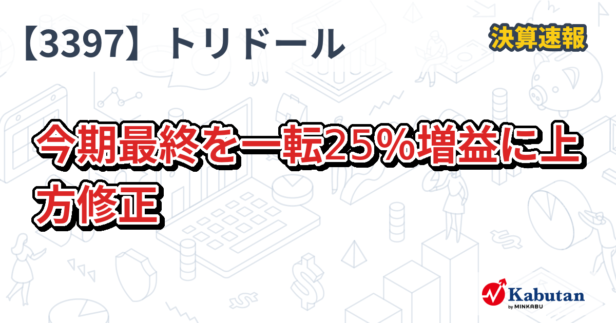 トリドールホールディングス【3397】、今期最終を一転25%増益に上方修正 | 株探ニュース トリドールホールディングス <3397> [東証P] が11月14日後場(13:10)に決算(国際会計基準=IFRS)を発表。24年3月期第2四半期累計(4-9月)の連結最終利益は前年同期比4.1%増の45.9億円に伸び・・・。kabutan.jp