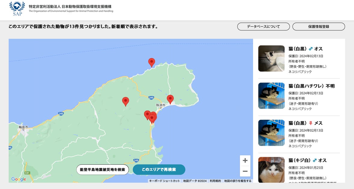 被災地で保護された動物のデータベースです。