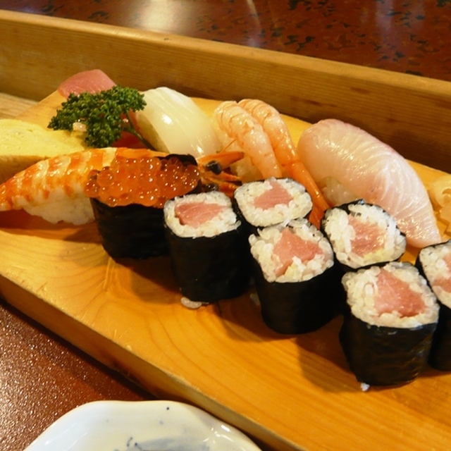 I'm Yosaku who lives in Osu, Nagoya. I went to Yajihei in Ichiban, Atsuta-ku, Nagoya City. This is a popular sushi restaurant in the area with many local regular customers. On weekdays, the sushi set meal for 1,100 yen, which includes assorted sushi, steamed egg custard, miso soup, and fruit, is very popular. The restaurant is run by a friendly couple who love to talk.