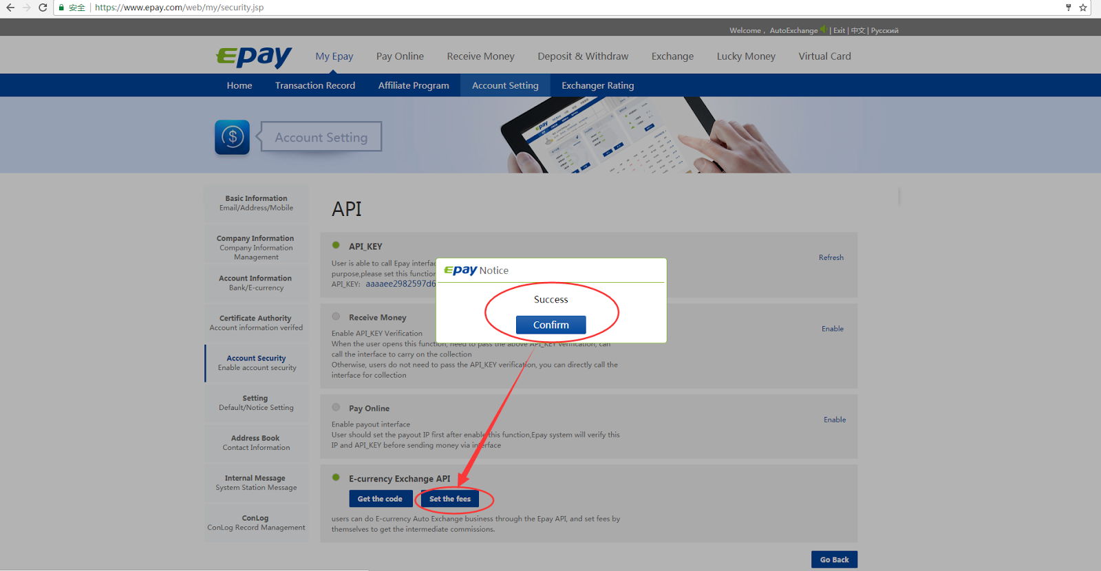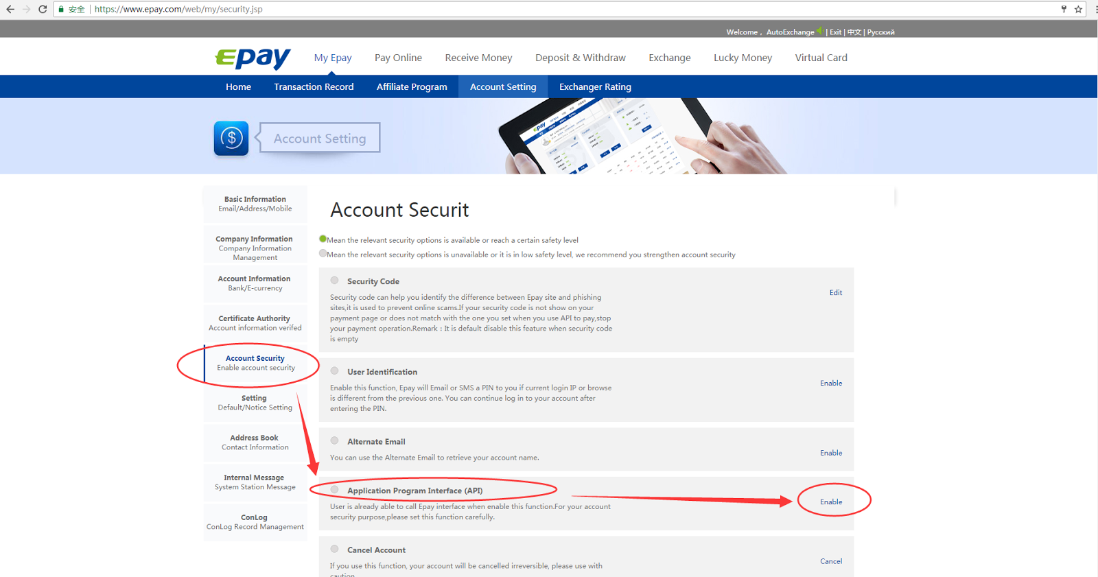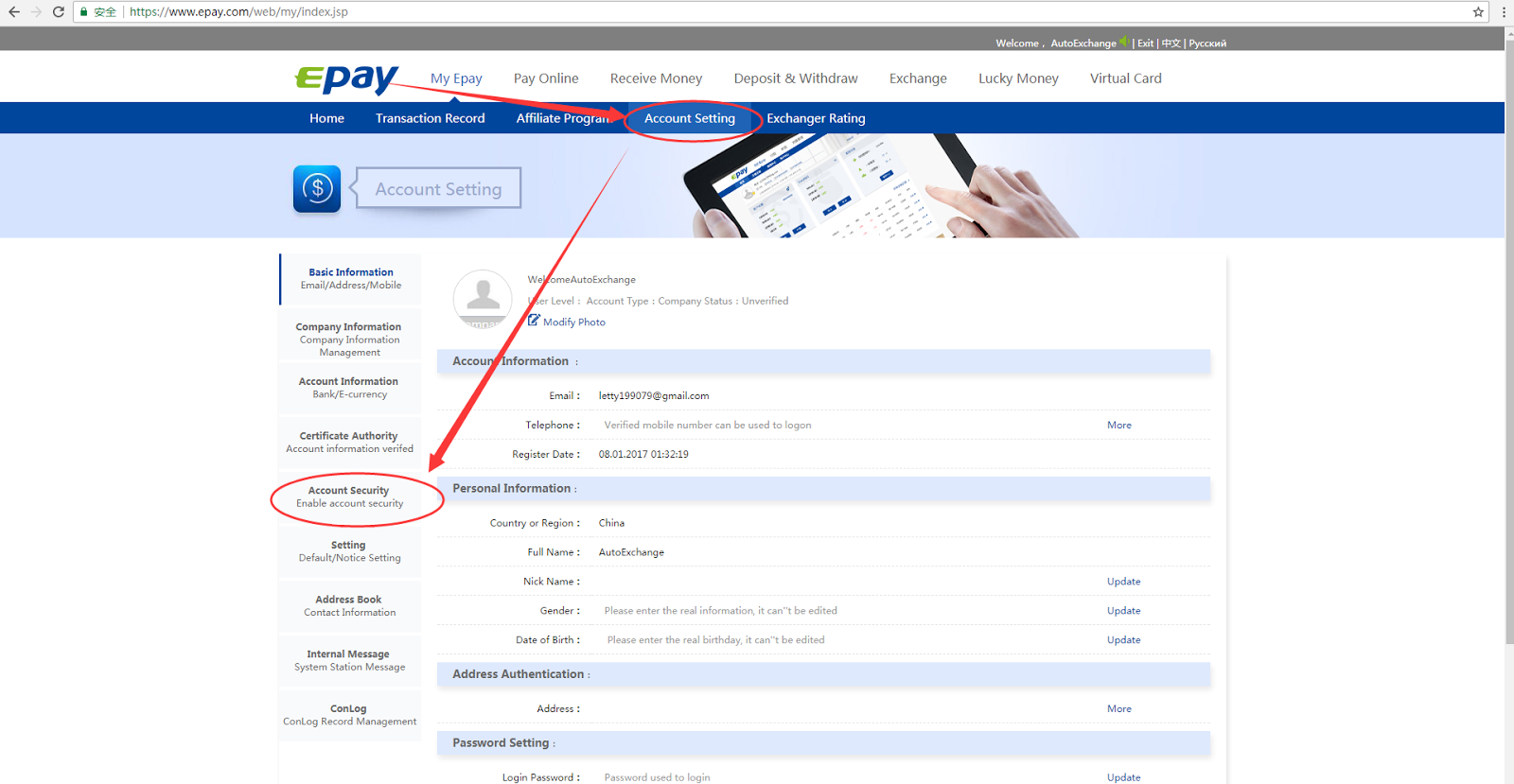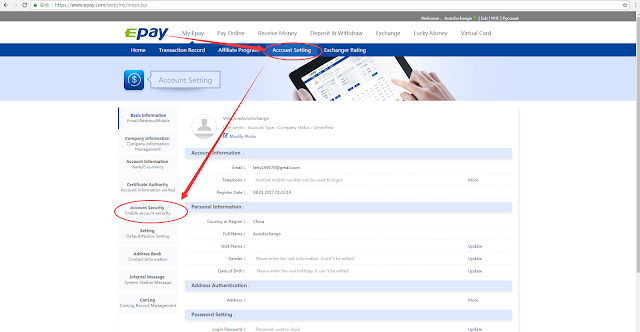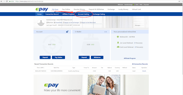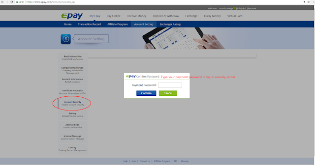 Step1: Log into your Epay account, Click 'My Epay' --> 'Account Setting', as shown in the image