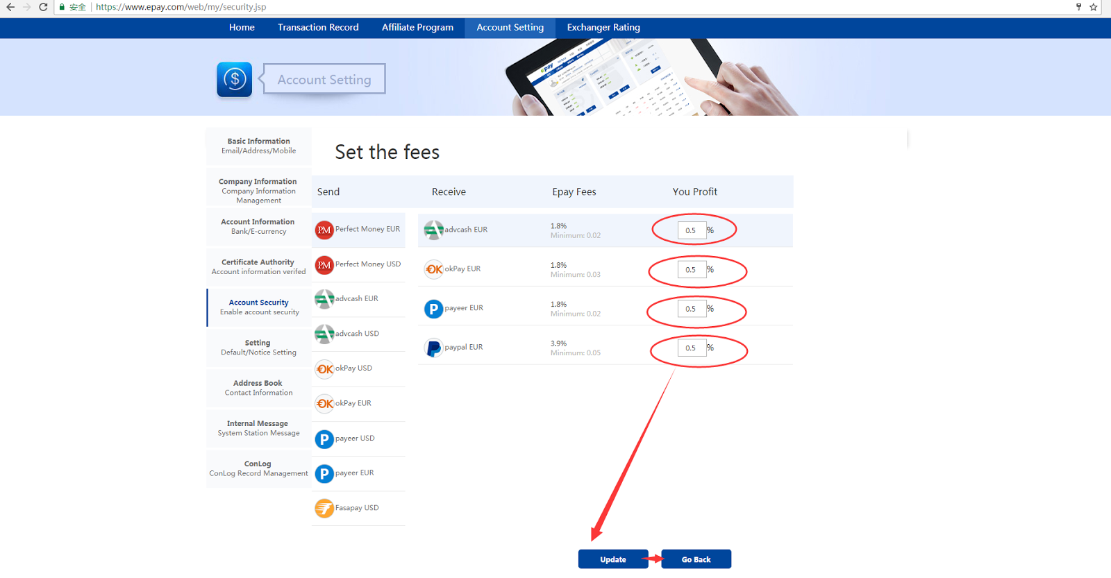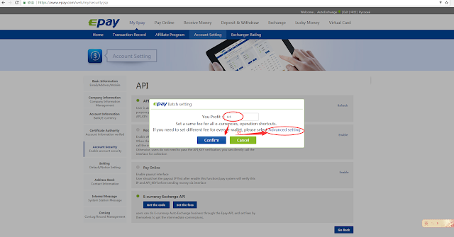 1) In this step, you can set a same fee for all e-currencies at one time, only need to enter the value what you want in 'you profit' box, click 'confirm', all done!