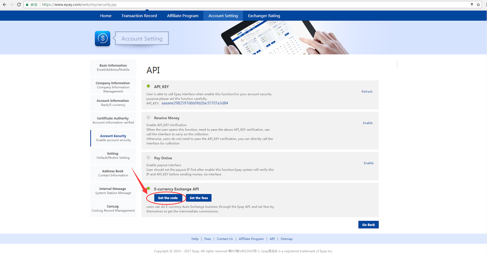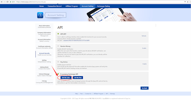 Step7: After completing the fee setting, click 'Go Back' to return to 'API' page, you need to 'Get the code', as shown below: