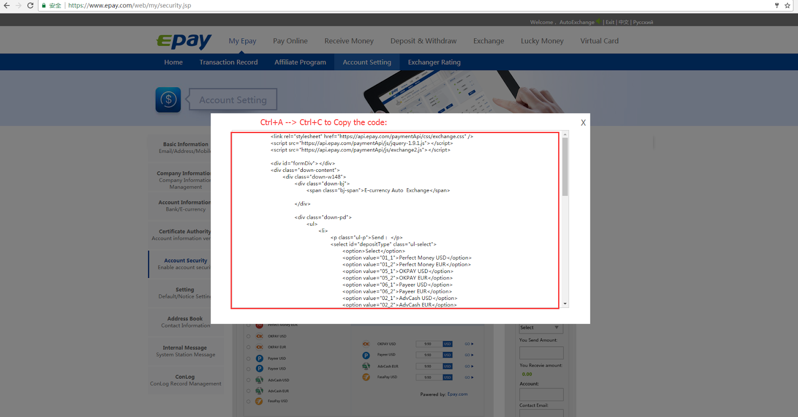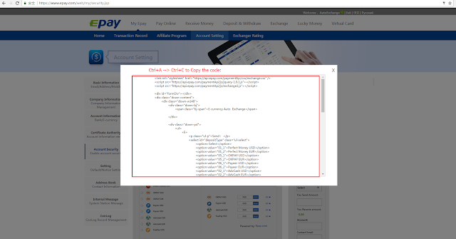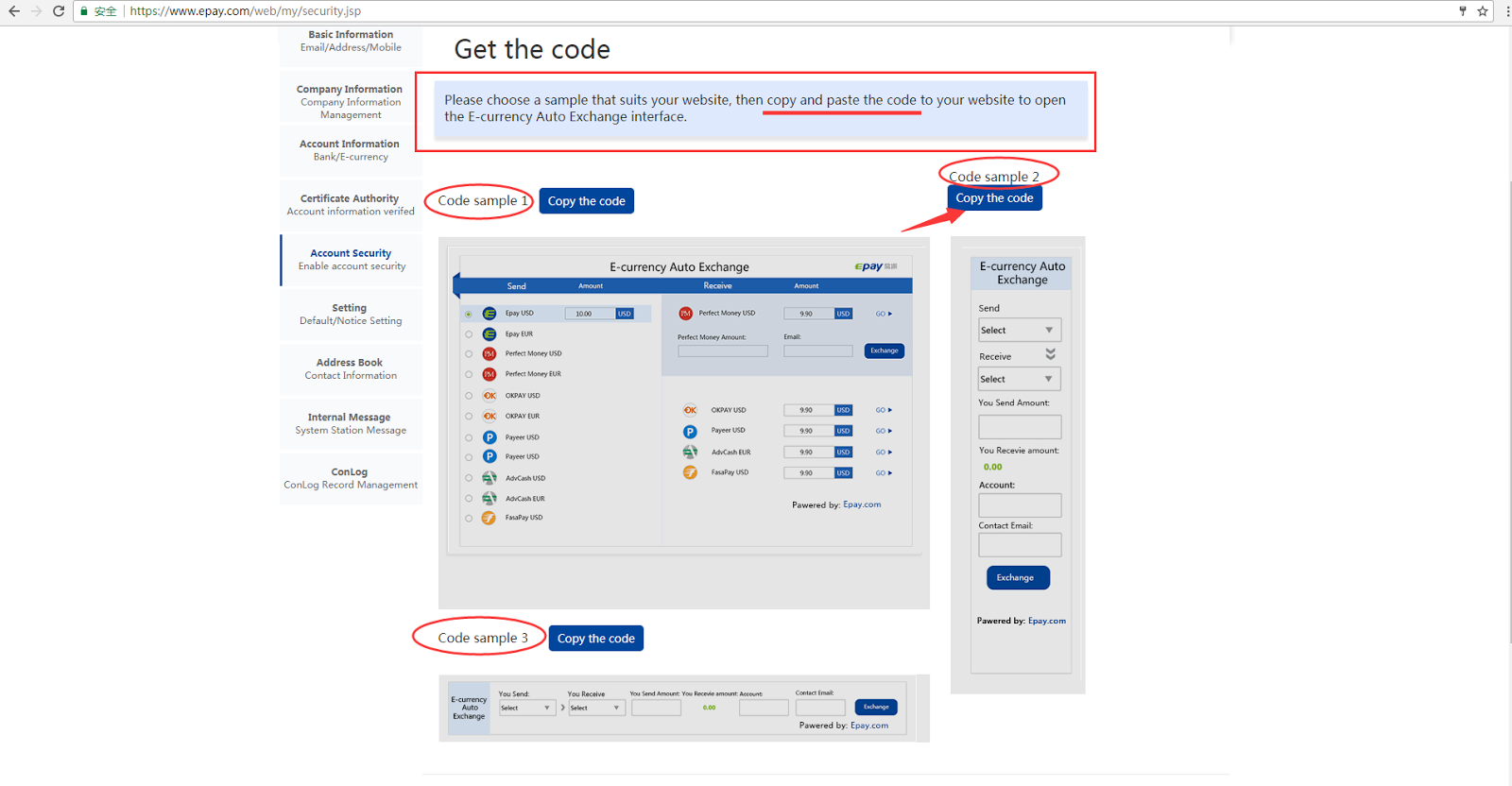 Step8: Click 'Get the code', you can see three kinds of 'E-currency Auto Exchange Script' samples, you can choose any sample what you like, click 'corresponding Code sample', as shown in the image.