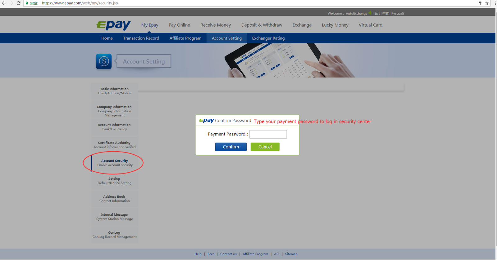 Step3: Type your payment passwork to log into the security center, as shown below:
