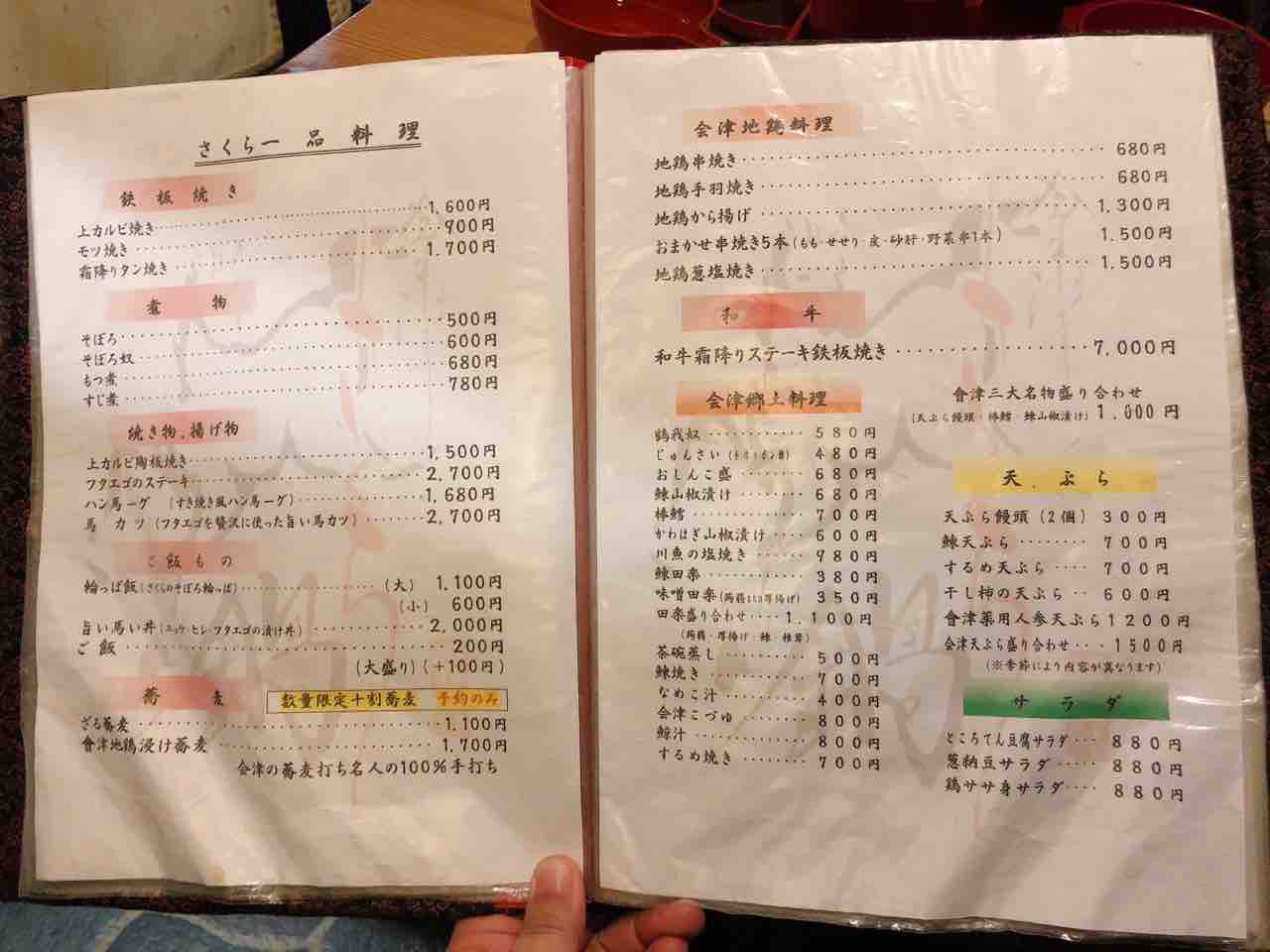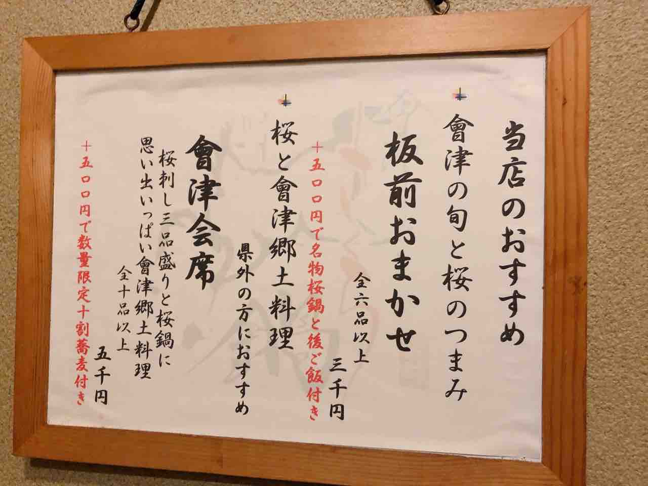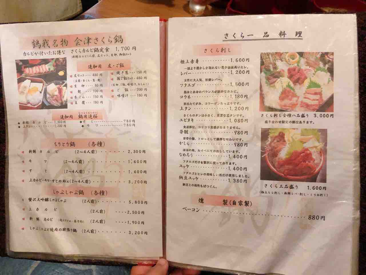 さくら鍋鶴我会津若松駅から車で5分程。メニュー。今回は満腹コースを注文。御膳で運ばれた野菜料理と蓴菜。特に郷土料理とかでは無いが、地元の野菜を使った料理を提供との事。茶碗蒸し。さくら刺し全品八種盛り。極上赤身、レバー、フタエゴ、コウネ、上タン、ユビヌキ、脊髄、カシラ。個人的には赤身と脊髄が美味。馬のもつ煮込み。岩魚の塩焼き。名物さくら鍋。馬肉をすき焼き風のタレでしゃぶしゃぶ。卵黄と卵白のメレンゲに付けて頂く。馬肉の後に、野菜や豆腐を煮込んで頂く。白いご飯、味噌汁、お新香。お米で作ったアイス。--------------ボリュームは満点。予想ほどの質ではなかったが、名物の馬肉を堪能出来た。--------------さくら鍋 鶴我0242-29-4829福島県会津若松市東栄町4-21 https://tabelog.com/fukushima/A0705/A070501/7001819/