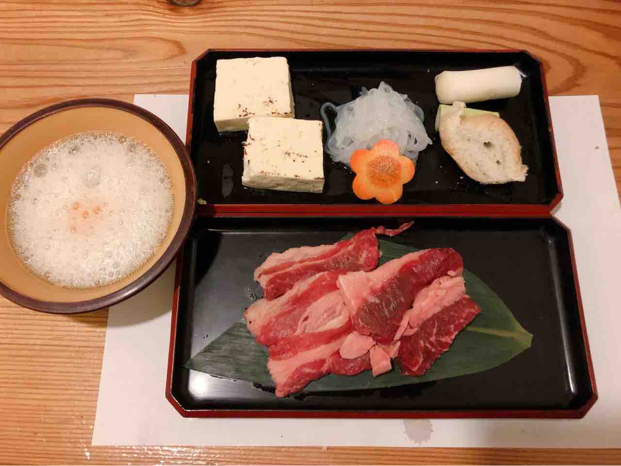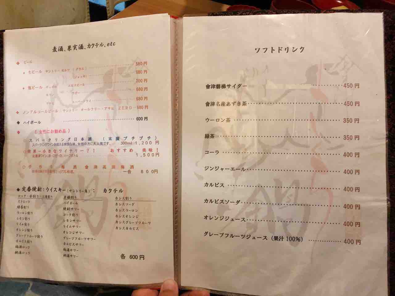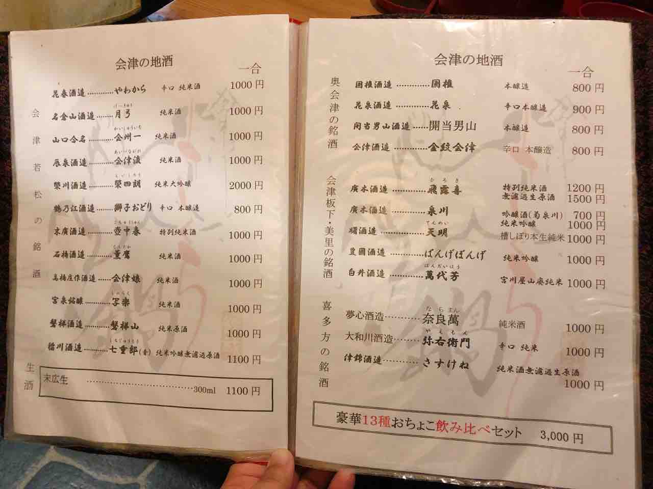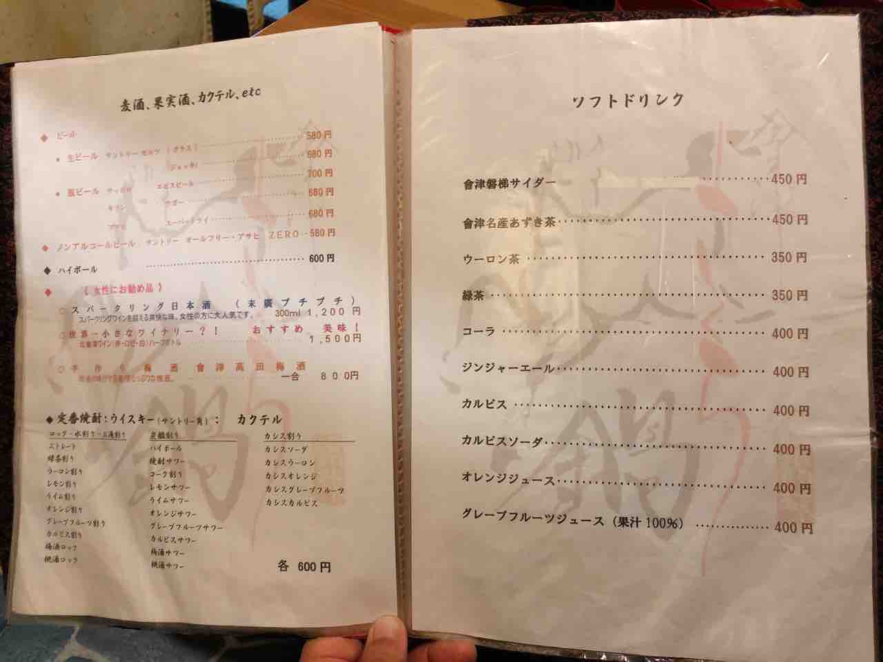 さくら鍋鶴我会津若松駅から車で5分程。メニュー。今回は満腹コースを注文。御膳で運ばれた野菜料理と蓴菜。特に郷土料理とかでは無いが、地元の野菜を使った料理を提供との事。茶碗蒸し。さくら刺し全品八種盛り。極上赤身、レバー、フタエゴ、コウネ、上タン、ユビヌキ、脊髄、カシラ。個人的には赤身と脊髄が美味。馬のもつ煮込み。岩魚の塩焼き。名物さくら鍋。馬肉をすき焼き風のタレでしゃぶしゃぶ。卵黄と卵白のメレンゲに付けて頂く。馬肉の後に、野菜や豆腐を煮込んで頂く。白いご飯、味噌汁、お新香。お米で作ったアイス。--------------ボリュームは満点。予想ほどの質ではなかったが、名物の馬肉を堪能出来た。--------------さくら鍋 鶴我0242-29-4829福島県会津若松市東栄町4-21 https://tabelog.com/fukushima/A0705/A070501/7001819/