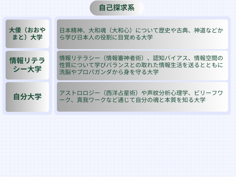 今回の講座は、「自己探求系」大学のうちの「自分大学」にあたります。
