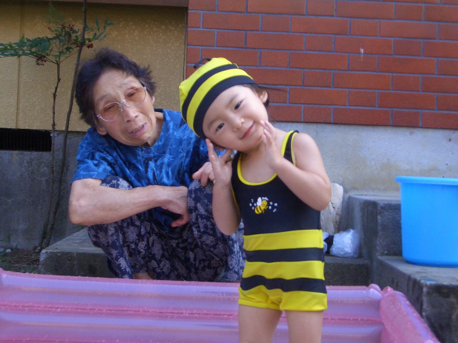 今日は玄関先でプールに入れて遊ばせました♪触覚があんまり見えないけど、ミツバチ姿の水着なのだ!