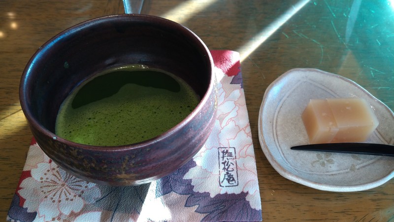 喫茶室でお抹茶と高麗人参の羊羹をいただく。