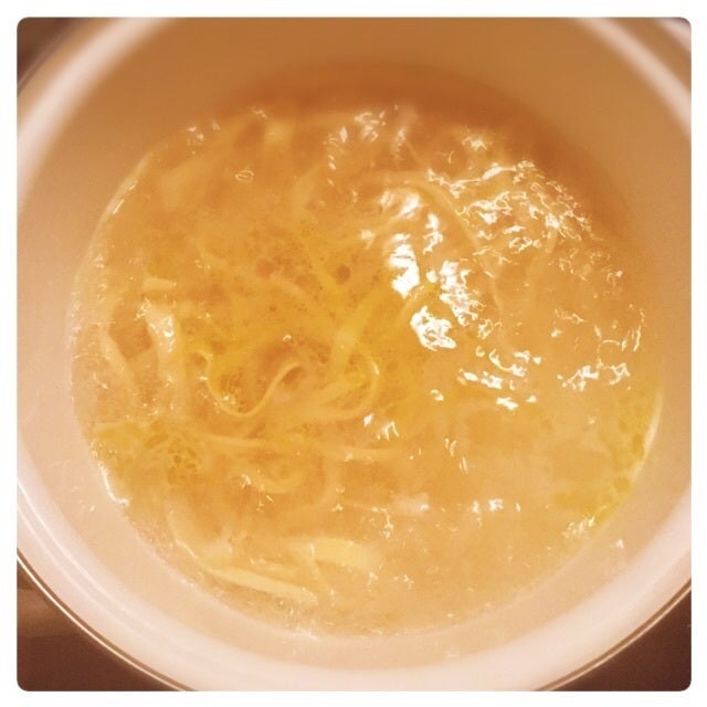 たっぷりのお湯にオリーブ油、塩を一緒にいれて、約5分くらい茹でます。