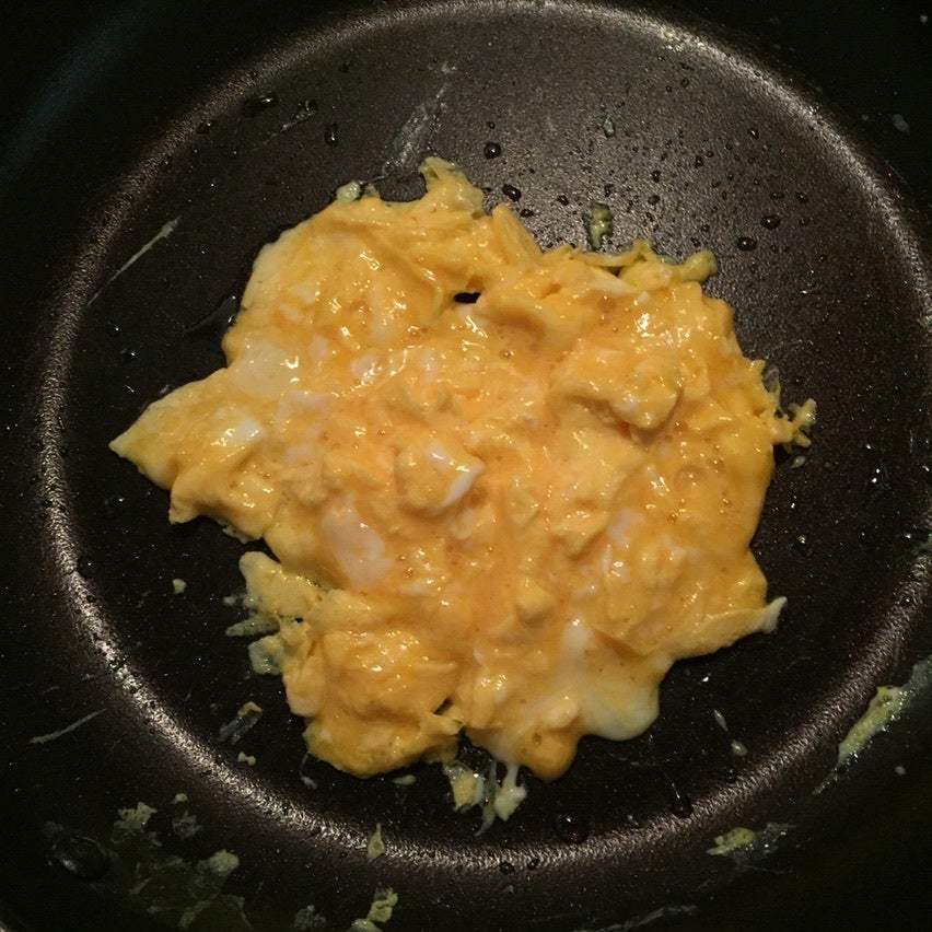 ③で用意した半熟卵をフライパンに戻して混ぜ合わせます。