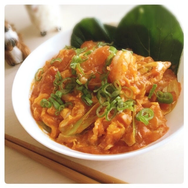 ②で合わせたチリソースを入れて、ゆっくり混ぜ合わせます。